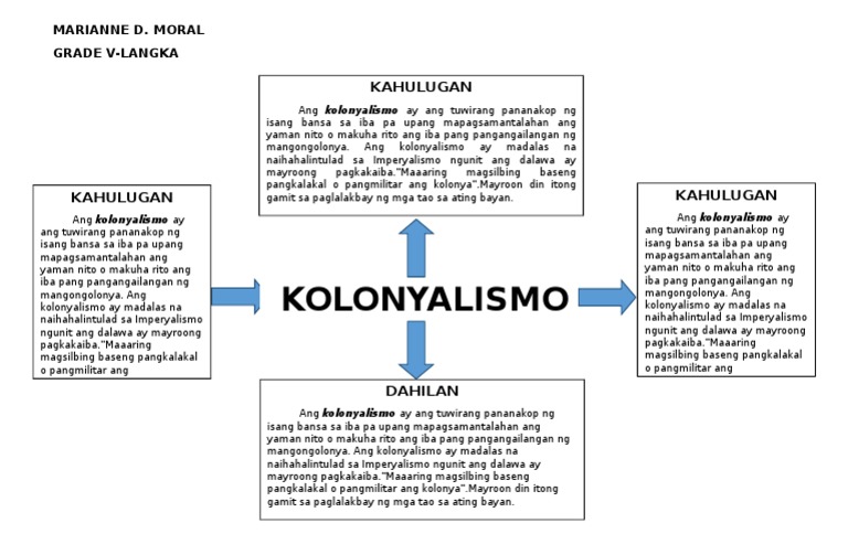 Pumili ng Pinuno Tagarekord at Tagapag ulat. Ang klase ay pangkatin sa limaBawat pangkat ay maghahanda presentasyon alinsunod sa paksang nakataga sa kanila. Ano ang kahulugan ng kolonyalismo - 466457 clarissadona clarissadona 10112016 Araling Panlipunan.