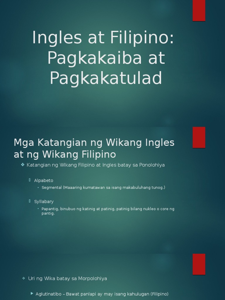 Venn diagram pagkakaiba at pagkakatulad ng tagalog at filipino. Ang wikang Pilipino ay ang Filipino National Language noong 1943 na batay sa Tagalog mula noong 1959 nang ipasa ang Department Order No. 7 ng nooy Sec. Ubod ng Konseptong Filipino Miskonsepsyon sa Filipino Ang pinakaubod ng konsepto ng Filipino bilang batay sa mga wika ng Pilipinas ay ang pagiging pambansang lingua franca nito.
