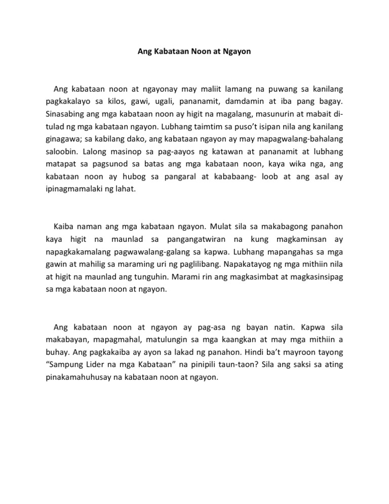 Ang pagbibinata ng babae ay nangyayari sa mga lalaki mga dalawang taon na ang nakalilipas. Sep 28 2021 ANG WIKANG FILIPINO NOON AT NGAYON. Ang kabataan noon ay hindi pa nila ganong alam ang tungkol sa teknolohiya ngunit ngayon napakadali nalang turuan ang mga bata.